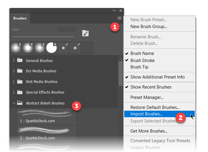- คลิ๊กไปที่ hamburger menu ที่อยู่บนขอบด้านขวาของ panel และทำการกดไปที่ Import Brushes