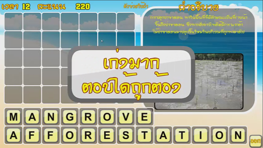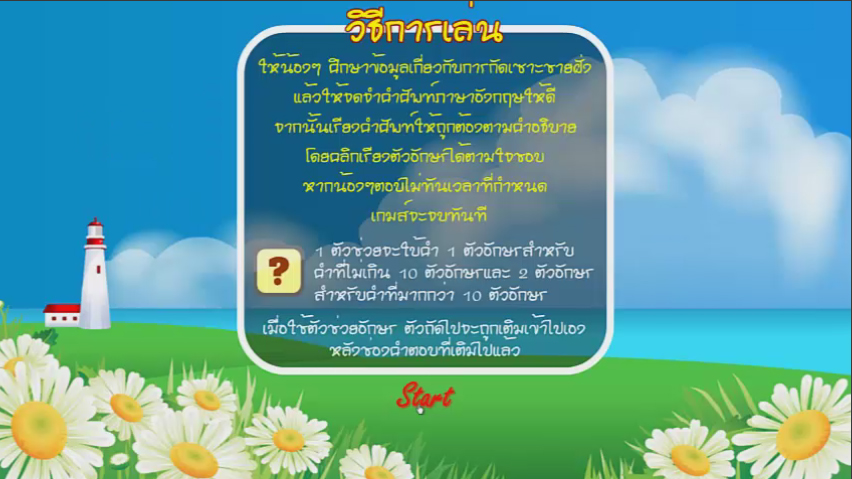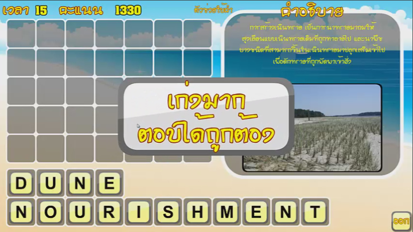 งาน2D เกมส์ Coasta-destruction วิธีการเล่น “ใส่คำที่ถูกต้องลงในช่องว่าง เพื่อให้ได้คำที่ตรงกับข้อมูลที่ให้มา”