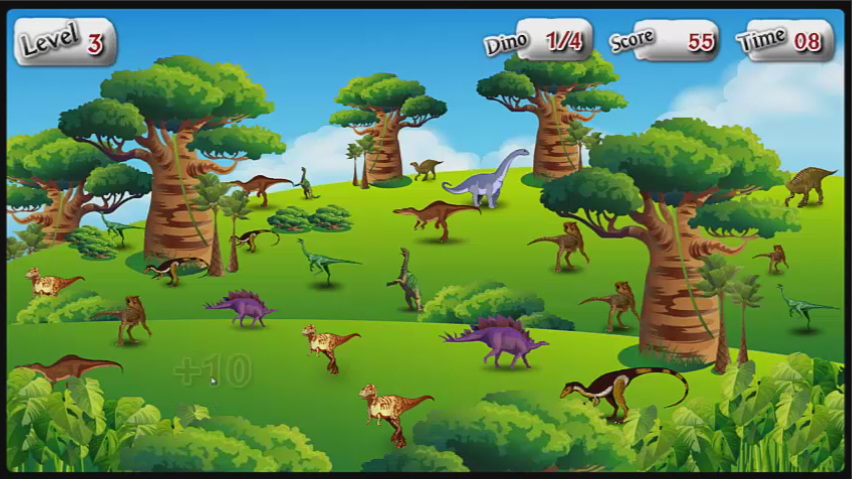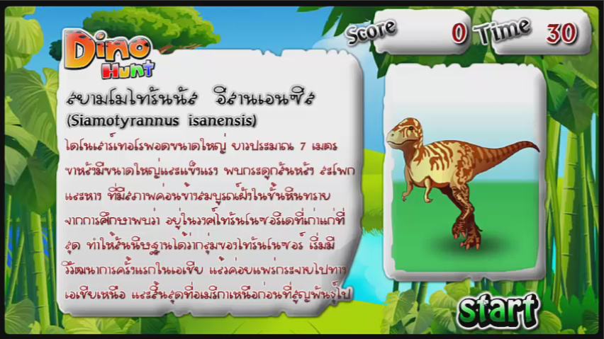 2D game DinoHunt ตามล่าหาไดโนเสาร์ ให้ตามหาไดโนเสาร์ที่มีอยู่ในรูปตัวอย่าง ให้ครบตามจำนวนที่กำหนดไว้ในแต่ละด่านให้ทันภายในเวลาที่กำหนด