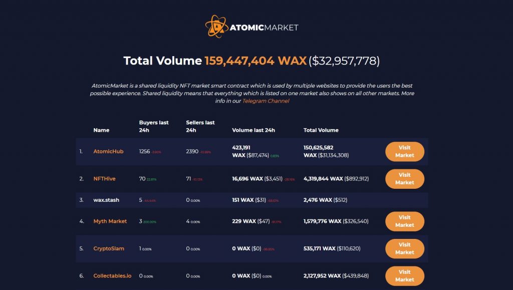 AtomicMarket เป็น smart contract ของตลาด NFT ที่ใช้งานร่วมกันกับเว็บไซต์หลาย ๆ แห่ง หมายความว่าทุกอย่างที่แสดงในตลาดหนึ่ง จะแสดงในตลาดอื่น ๆ ด้วยทั้งหมด อย่างไรก็ตามตัวตลาดทำงานอยู่บนระบบ Eosio Blockchain ไม่ใช่ Ethereum Blockchain ดังนั้นตัวผลงานจะอยู่บนมาตรฐาน Atomic Asset