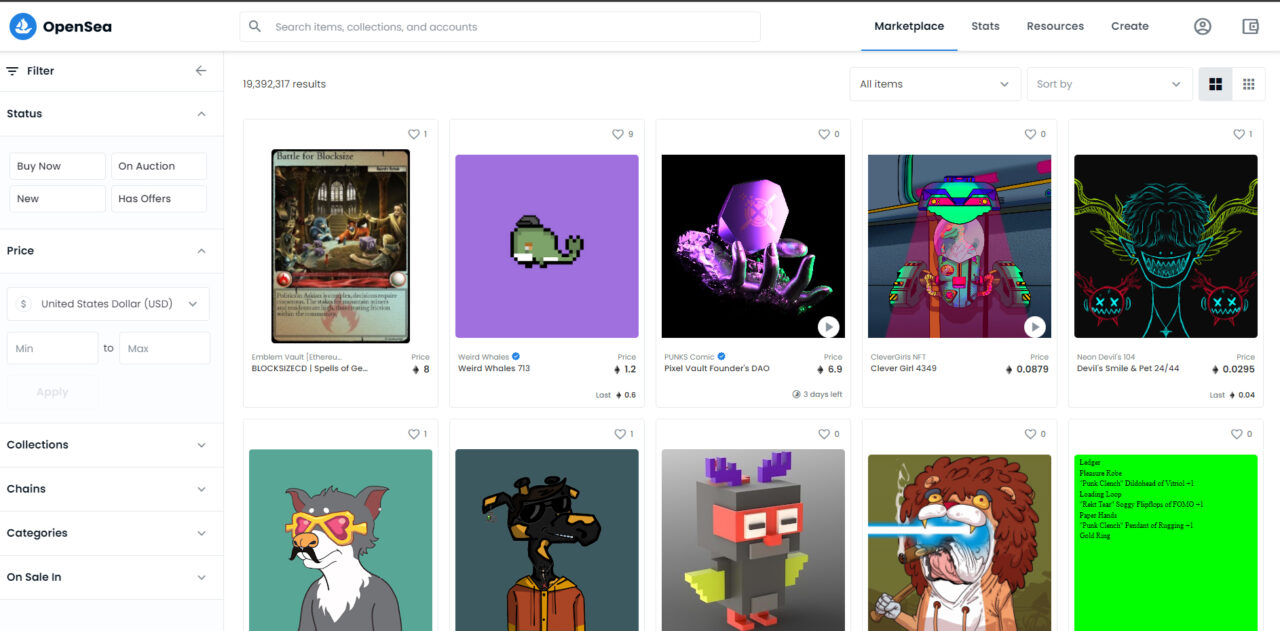 OpenSea ได้ชื่อว่าเป็นตลาด NFT เบอร์ 1 ของโลกในตอนนี้ และเป็นตลาดที่ใหญ่ที่สุดเหนือทุกตลาด NFT และด้วยขนาดที่ใหญ่ ทำให้ OpenSea เต็มไปด้วยผลงานที่หลากหลาย ตั้งแต่ผลงานศิลปะ, ชื่อโดเมน, วิชวลเวิลด์, การ์ดซื้อขายต่าง ๆ, กีฬา, และของสะสม ประกอบด้วย ERC721 และ ERC1155
