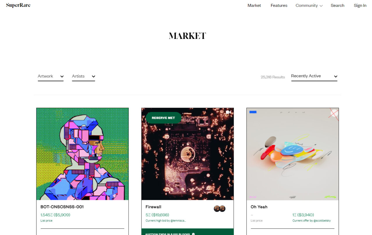 SuperRare มีความเป็นโซเชียลมีเดียมากกว่าจะเป็นตลาด ด้วยระบบบน Blockchain ทำให้ตัวผลงานสามารถยืนยันได้ว่าเป็นของแท้ และเหมาะที่จะใช้สำหรับสภาพแวดล้อมแบบโซเชียล ธุรกรรมทั้งหมดบนตัวแพลตฟอร์มใช้เหรียญ ETH หรือ Ethereum เป็นตัวกลาง