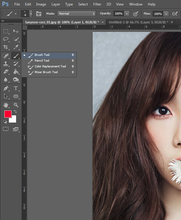 ขั้นแรกเปิด photoshop แล้วเลือกรูปภาพที่ต้องการย้อมสีผมออกมา