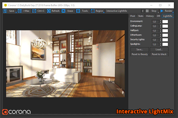 - Interactive LightMix ถือเป็นฟีเจอร์หลักที่เพิ่มมาใน Corona Renderer เวอร์ชั่น 1.5 ซึ่งจะช่วยปรับค่าความเข้ม (Intensity), สีของแสง, และแสงที่ปลดปล่อยออกมาจาก Materials ในช่วงระหว่างและหลังการเร็นเดอร์ ทั้งนี้ Interactive LightMix ถือเป็นฟีเจอร์ที่เหมาะมากสำหรับคนที่ต้องการเซ็ตค่าแสงบรรยากาศจากช่วงเวลาหนึ่งไปยังอีกช่วงเวลาหนึ่ง เช่น เย็นไปหัวค่ำ เป็นต้น