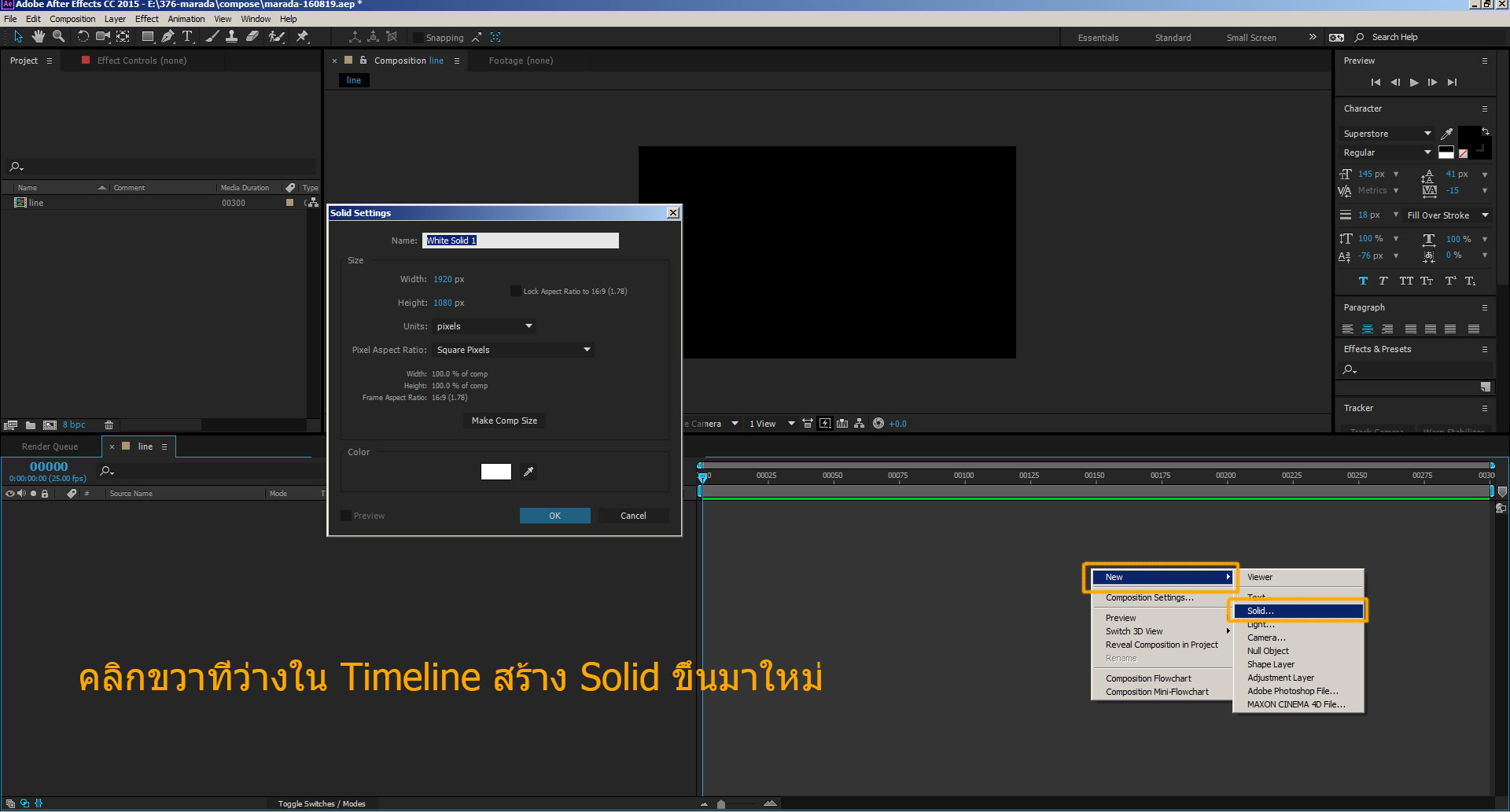 จากนั้นคลิกขวาที่วางใน Timeline เลือก New > Solid… หรือถ้าเข้าทางเมนุบาร์ก็อยู่ใน Layer > New > Solid… ใน Solid Setting ใช้ค่าเริ่มต้นที่ให้มาเลย ขนาดของ Solid จะถูกกำหนดให้เท่ากับ ขนาดของ Composition อยู่แล้ว ส่วนสีก็ไม่มีผลอะไร