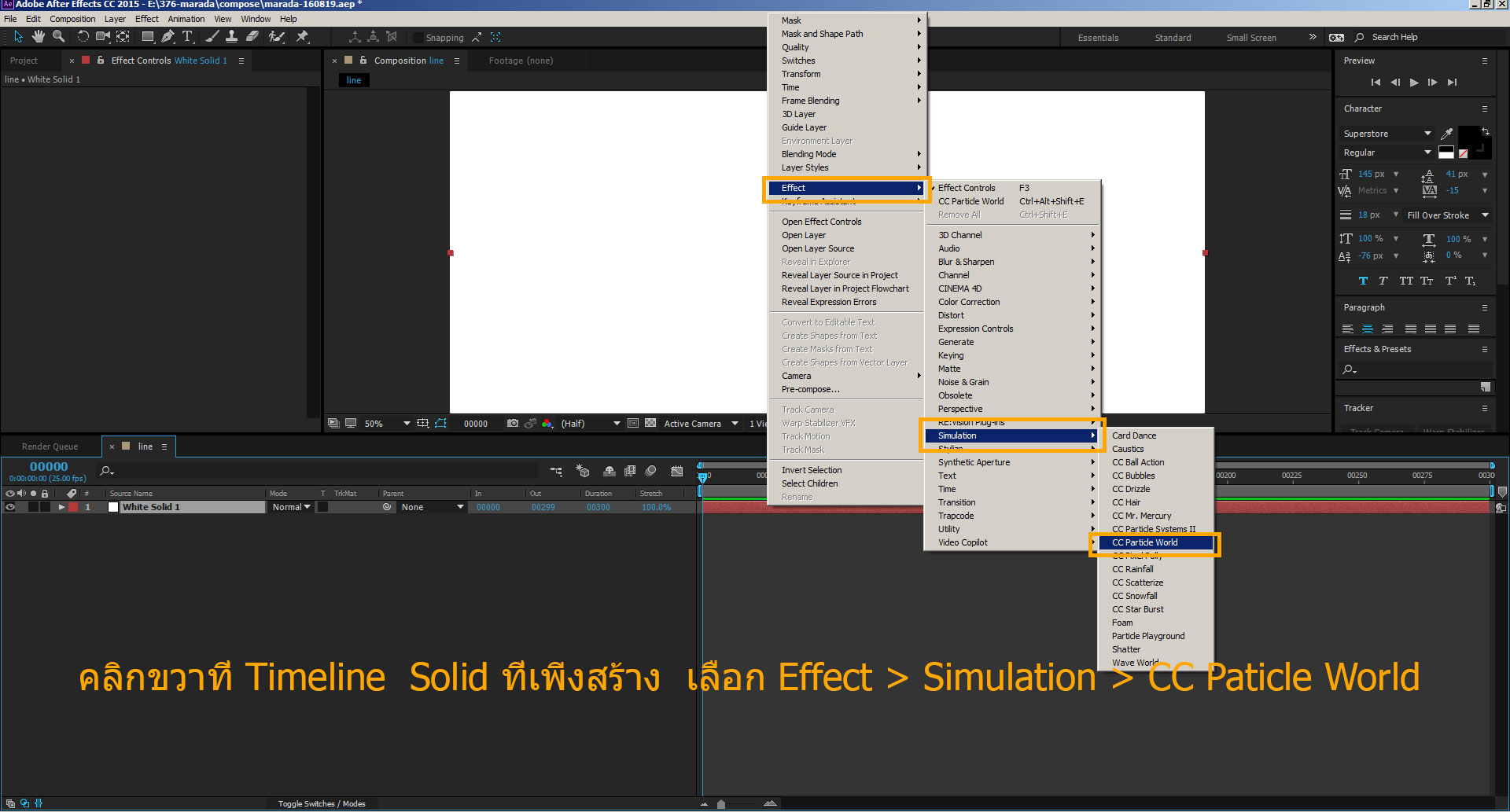 ต่อไปเราจะสร้าง Paticle ตัวเอกของงานกัน คลิกขวา Timeline ของ Solid ที่เพิ่งขึ้นมา เลือก Effect > Simulation > CC Paticle World หรือเลือกจากเมนูบาร์ก็ชื่อกลุ่มคำสั่งเดียวกัน