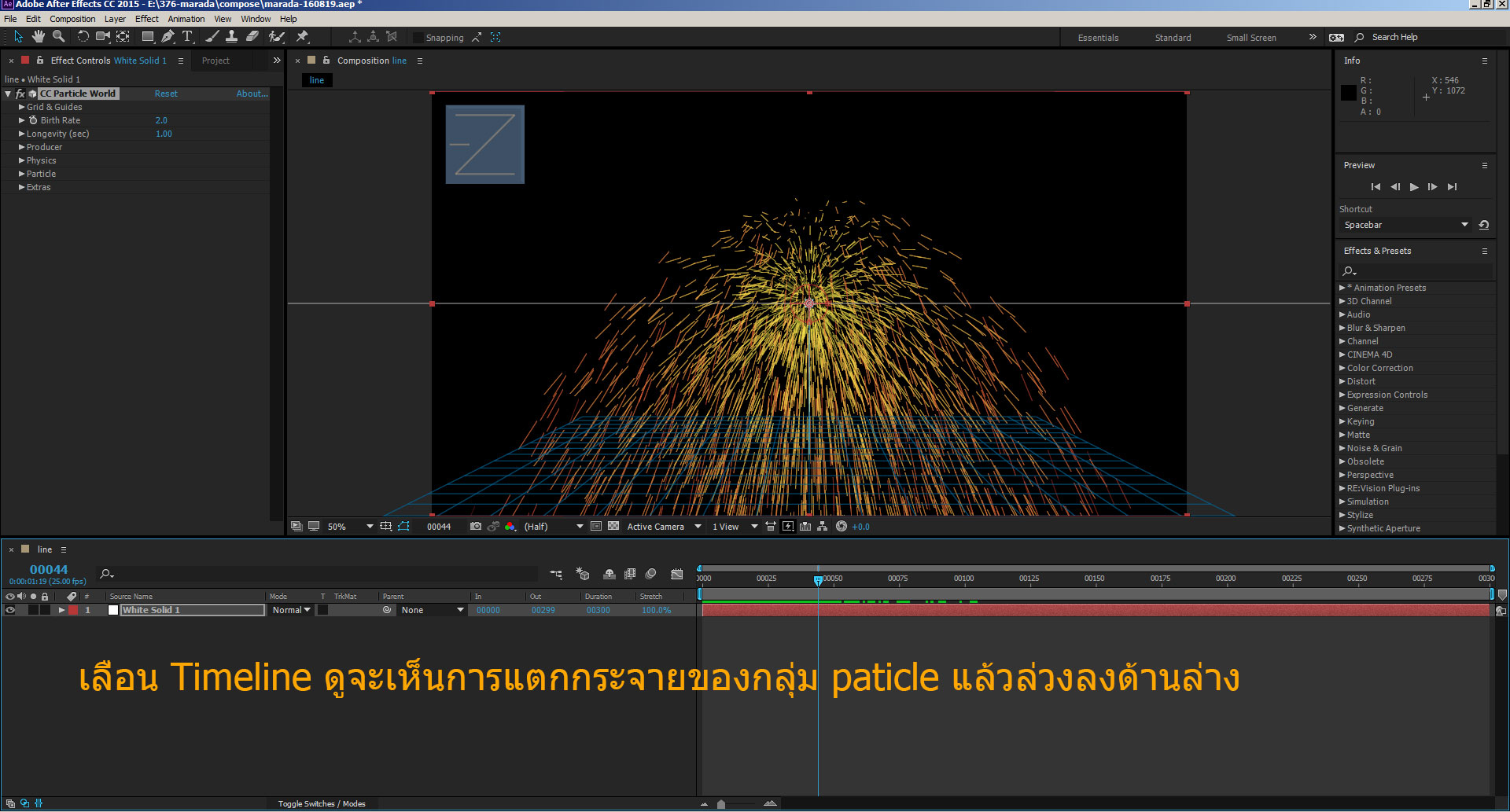 ตอนนี้หากลองเลื่อน Timeline ดู จะเห็น Paticle พุ่งกระจายออกมาแล้วล่วงลงด้านล่าง ซึ่งไม่ใช่ในสิ่งที่เราต้องการ เราจะต้องทำให้ Paticle ออกอยู่กำที่ จุดเกิด Paticle และจุดจบของ Paticle เป็นตำแหน่งเดียวกัน