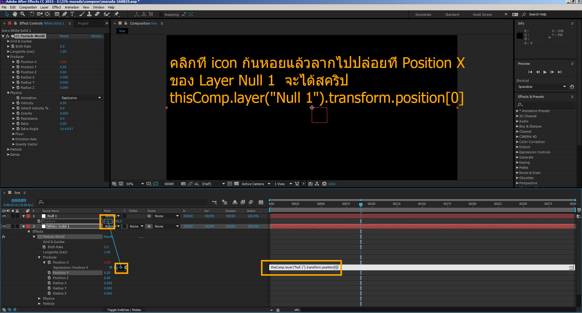 คลิกและลาก Icon รูปก้นหอยไปปล่อยที่ Position X ของ Null Object เราจะได้ Expression thisComp.layer(“Null 1”).transform.position[0] ซึงจะทำให้ ค่าของ Position X ของ CC Paticle World มีค่าเดียวกับ Position X ของ Null 1 คือ 960 ตัวเลขตรงนี้ก็ยังไม่ใช่ที่ต้องการ เพราะ ค่าเริ่มต้นของ Position X ของ CC Paticle World จะเริ่มที่ 0 ส่วน ค่าเริ่มต้นของ Position X ของ Null 1 จะเท่ากับครึ่งนึงของความกว้างของ Compotition