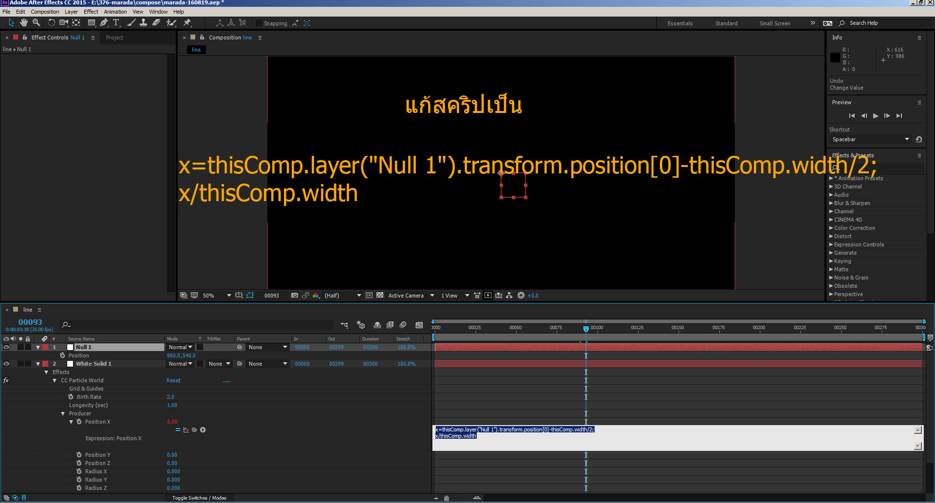 จะทำให้เมื่อเปลี่ยนค่า Position X ของ Null Object ค่าใน Position X ของ CC Paticle World ก็จะเปลี่ยนไปด้วยในค่าที่เท่ากัน แต่เนื่องจาก ค่าใน Position X ของ CC Paticle World นั้นถ้าเป็น 1 จะหมายถึงเคลื่อนที่ไปทางขวาเท่ากับขนาดของ Composition ซึ่งในที่นี้ก็คือ 1920px ทำให้ต้องมี Script ในบรรทัดที่สองเพิ่มขึ้นมาด้วย