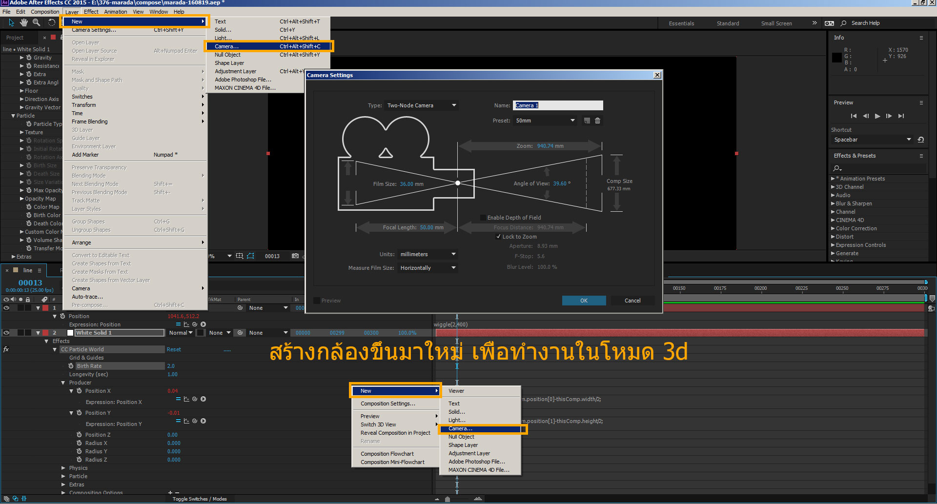ทำการสร้างกล้องขึ้นมาใหม่ โดยคลิกขวาที่ว่างใน Timeline หรือไปที่เมนูบาร์ในหมวด Layer แล้วเลือก New > Carera…
